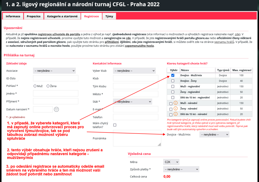 - pokud je tato možnost zapnuta o jedné či více kategorií, pak se pro hráče umožní hlásit si svoje týmy/dvojice pomocí následujícího online procesu