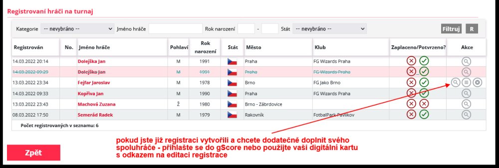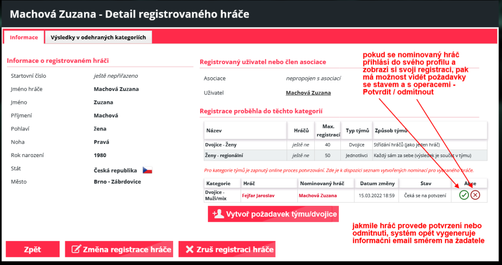 - možnost potvrzování nebo zamítnutí má nominovaný hráč i v případě, kdy se přihlásí do gScore pod svým účtem nebo ze své digitální karty a zobrazí si editaci své registrace pro vybraný turnaj