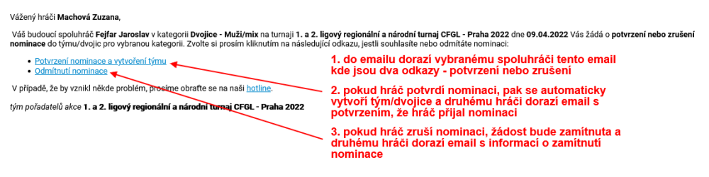 - pokud si hráč při registraci zvolí tímto způsobem hráče do týmu/dvojice, pak se po úspěšné registraci, odešle automaticky email nominovanému hráči