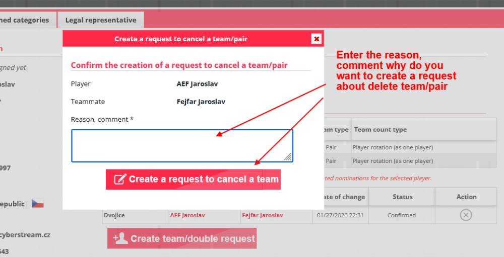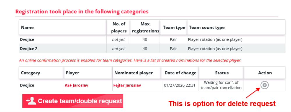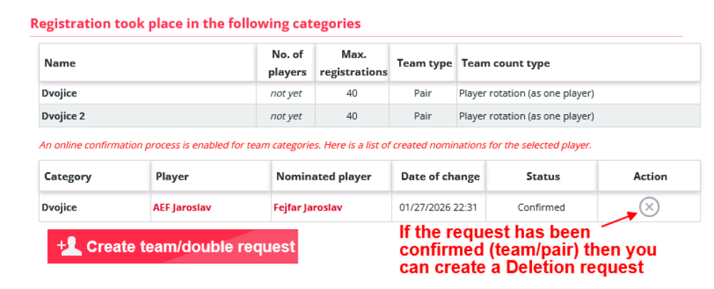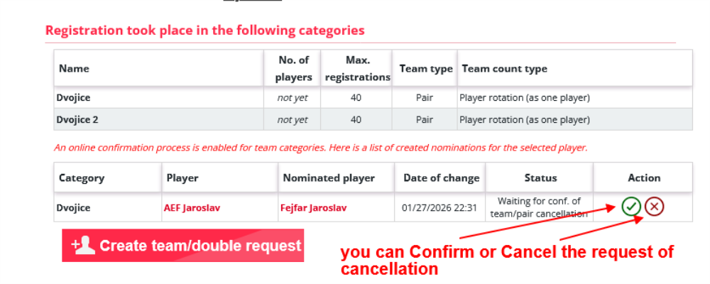 v případě, že požadavek hráč potvrdí, dojde k buď výmazu celého týmu/dvojice nebo k odstranění kategorie v které chtěl tým hrát - pokud je tým vytvořen pro více kategorií